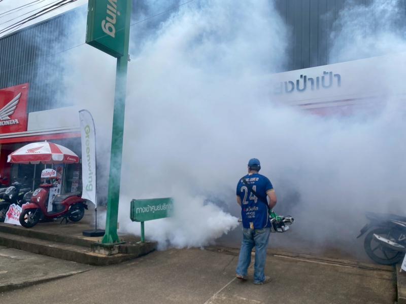พ่นหมอกควันป้องกันและควบคุมโรคไข้เลือดออก ณ บริเวณพื้นที่ชุมชนศรีเวียงทอง หมู่ที่ 10