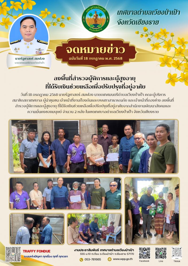 รายละเอียด : วันที่ 17 กรกฏาคม 2568 นายรัฐศาสตร์ สมฟอง นายกเทศมนตรีตำบลเวียงป่าเป้า เป็นประธานในการประชุมคณะกรรมการช่วยเหลือประชาชนเทศบาลตำบลเวียงป่าเป้า ซึ่งได้มีการพิจารณาผู้ด้อยโอกาสในเขตเทศบาลตำบลเวียงป่าเป้า จำนวน 42 ราย ที่ได้ยื่นคำร้องขอความช่วยด้านพัฒนาคุณภาพชีวิต การดำรงชีพ ตามโครงการพัฒนาคุณภาพชีวิตผู้ด้อยโอกาสในเขตเทศบาลตำบลเวียงป่าเป้า และได้กำหนดการมอบถุงยังชีพหรือเครื่องอุปโภคบริโภคที่จำเป็นให้แก่ผู้สูงอายุ ผู้พิการ ผู้ด้อยโอกาสในเขตเทศบาลตำบลเวียงป่าเป้า การประชุมในครั้งนี้ประกอบด้วยคณะผู้บริหาร ท้องถิ่นอำเภอ เกษตรอำเภอ ปศุสัตว์อำเภอ ผู้ใหญ่บ้าน ผู้นำชุมชน ปลัดเทศบาล หัวหน้าสำนักปลัดเทศบาล งานพัฒนาชุมชน และงานวิเคราะห์นโยบายและแผนเทศบาลตำบลเวียงป่าเป้า ณ ห้องประชุมสภาเทศบาลตำบลเวียงป่าเป้า ตำบลเวียง อำเภอเวียงป่าเป้า จังหวัดเชียงราย
