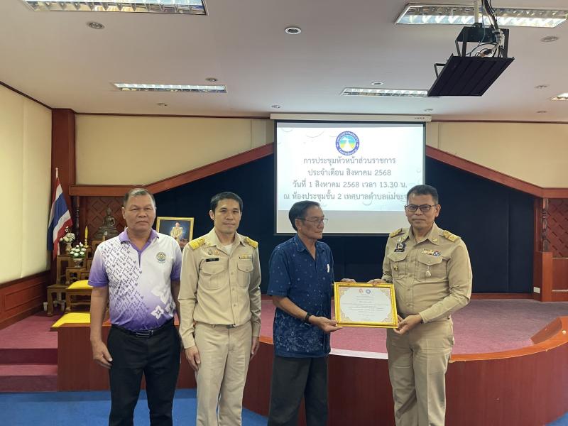 รายละเอียด : วันที่ 1 สิงหาคม 2568 นายรัฐศาสตร์ สมฟอง นายกเทศมนตรีตำบลเวียงป่าเป้า ได้มอบหมายให้นายดวงเนตร โยนิจ รองนายกเทศมนตรีตำบลเวียงป่าเป้า รับมอบเกียรติบัตรรางวัลชนะเลิศ องค์กรปกครองส่วนท้องถิ่นที่มีผลงานเป็นที่ประจักษ์ ด้านการป้องกันควบคุมโรคพิษสุนัขบ้า ระดับจังหวัด ตามโครงการ Thailand Rabies Award 2025 ในการประชุมหัวหน้าส่วนราชการประจำเดือน สิงหาคม 2568 ณ สำนักงานเทศบาลตำบลแม่ขะจาน อำเภอเวียงป่าเป้า จังหวัดเชียงราย