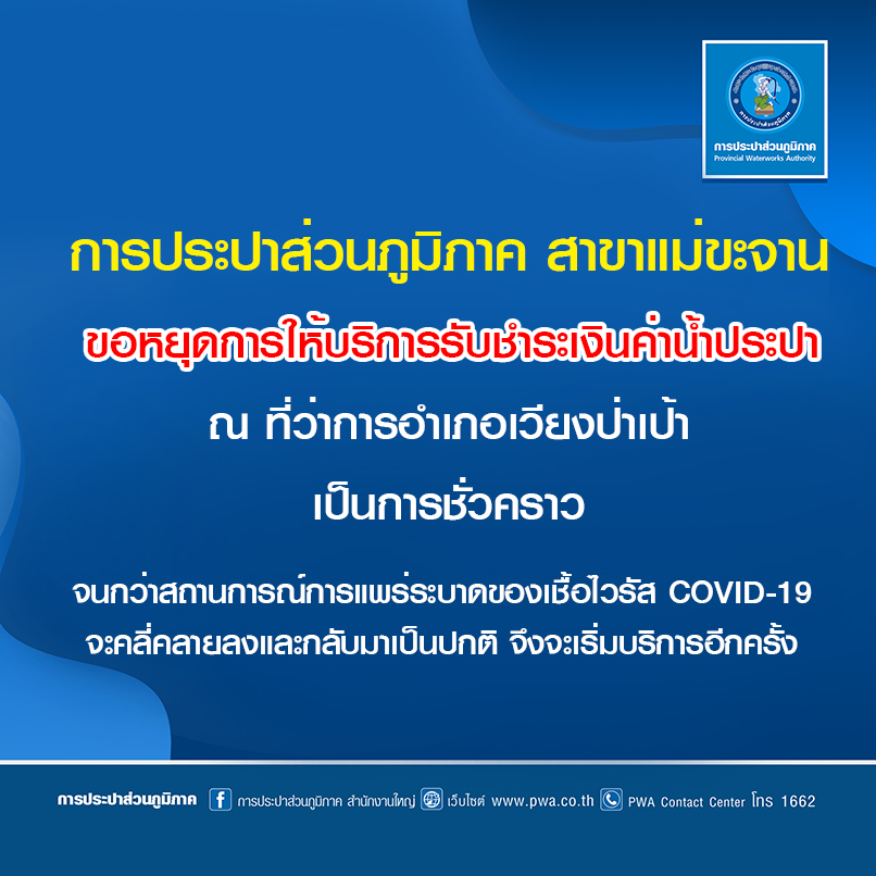 การประปาส่วนภูมิภาค สาขาแม่ขะจาน ขอหยุดการบริการชำระค่าน้ำประปา ณ ที่ว่าการอำเภอเวียงป่าเป้า ชั่วคราว เนื่องจากปัญหา COVID -19