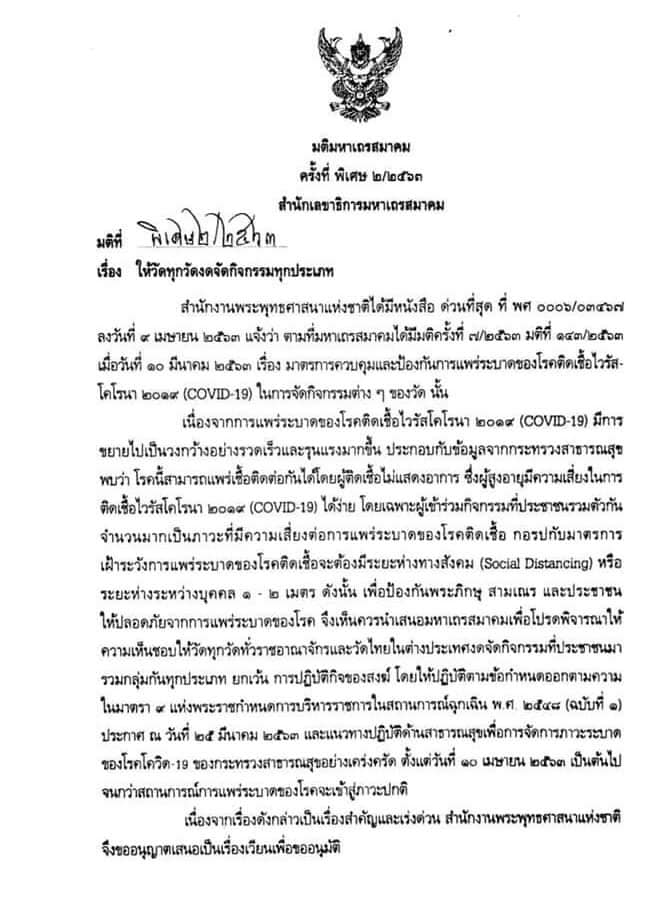 มติมหาเถรสมาคม เรื่อง ให้ทุกวัดงดกิจกรรมทุกประเภท ตั้งแต่ 10 เม.ย.2563 เป็นต้นไป เพื่อป้องกันการแพร่ระบาดของไวรัสโควิด-19