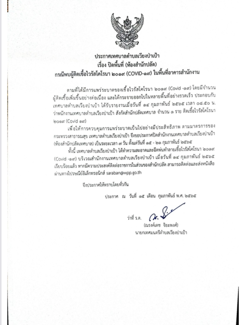 ประกาศปิดพื้นที่ห้องสำนักปลัดชั่วคราว เนื่องด้วยสถานการณ์โควิด 19