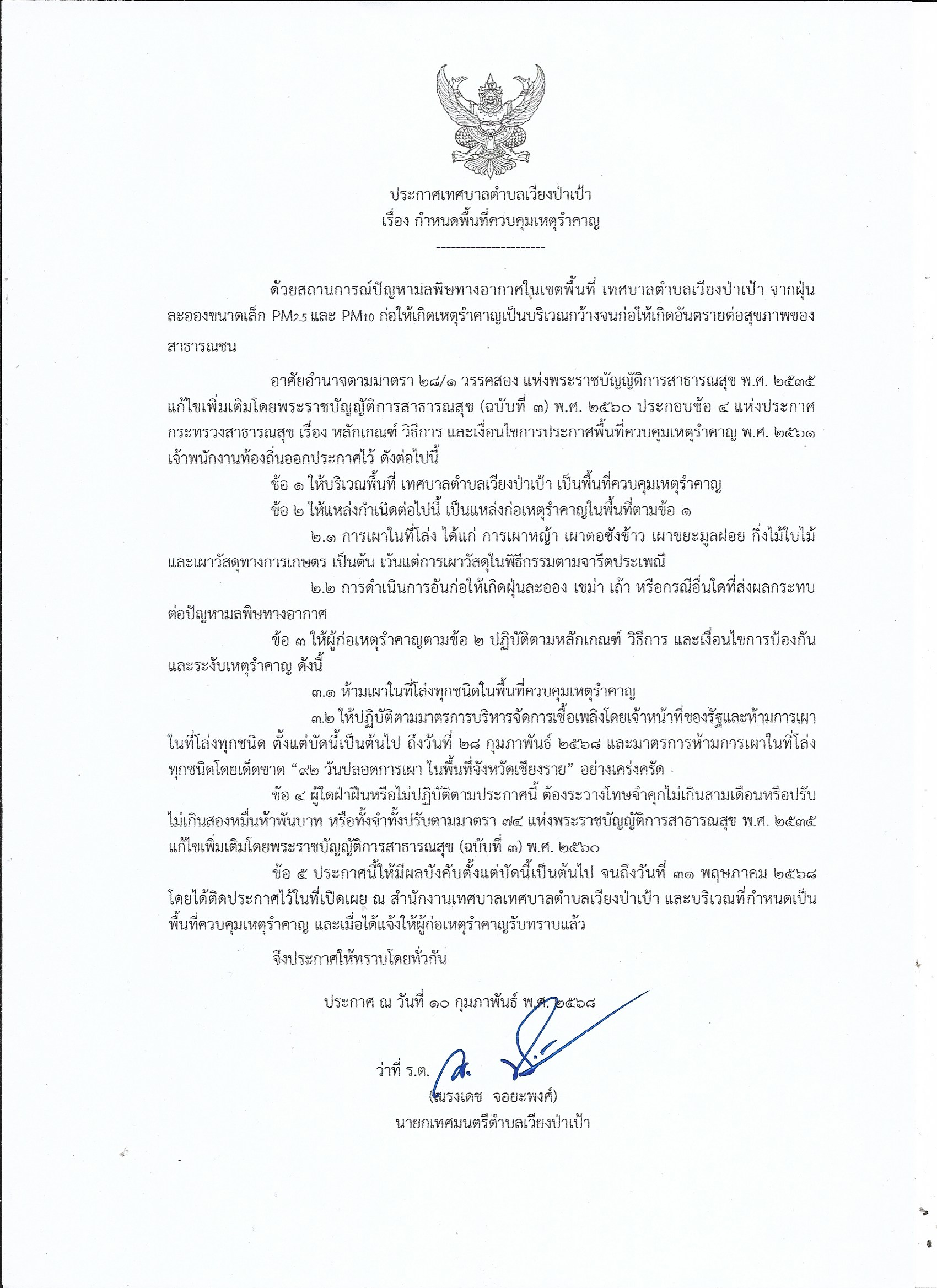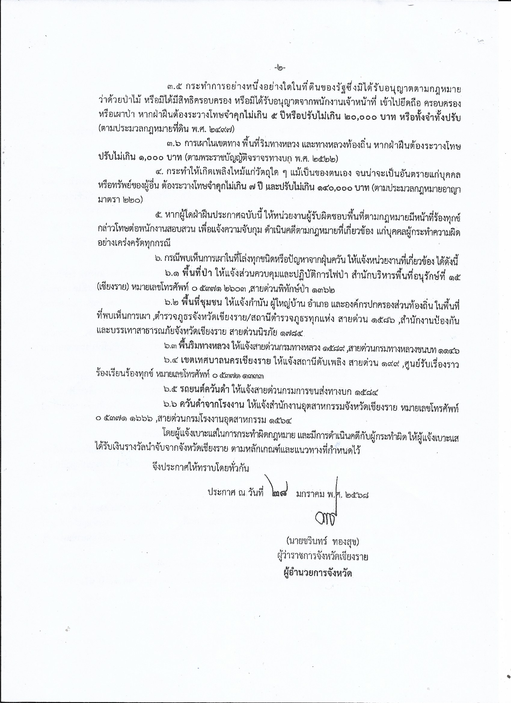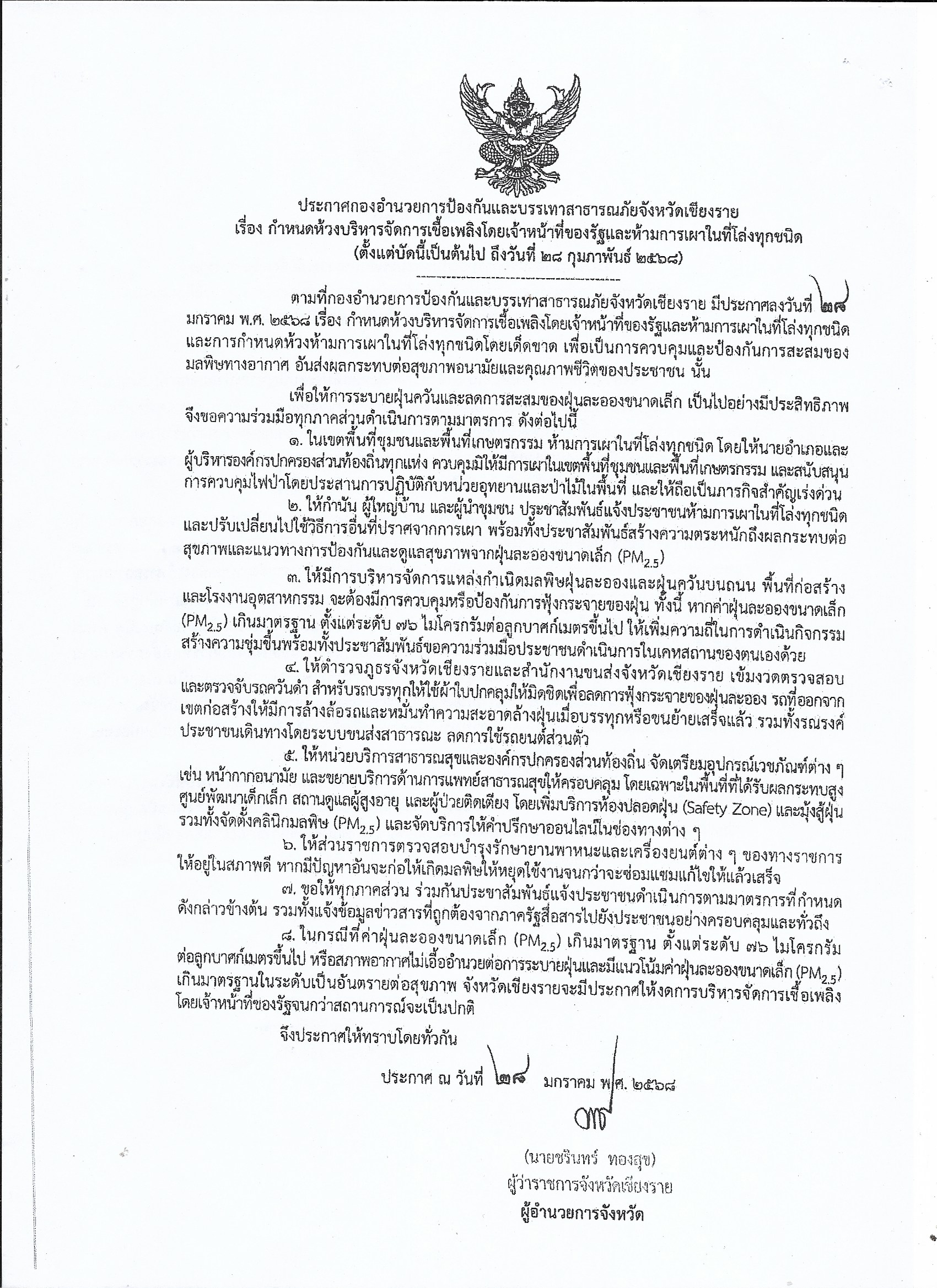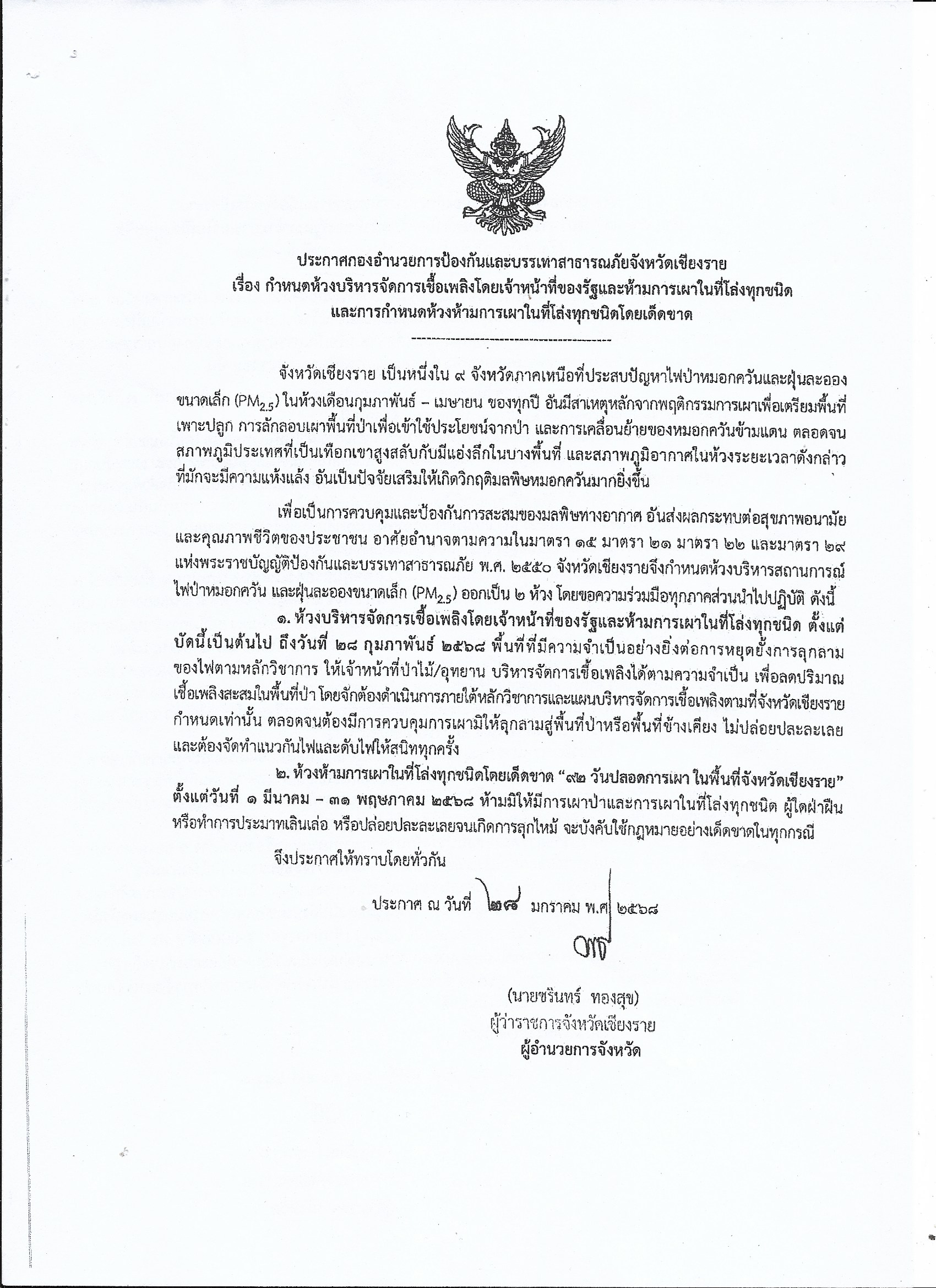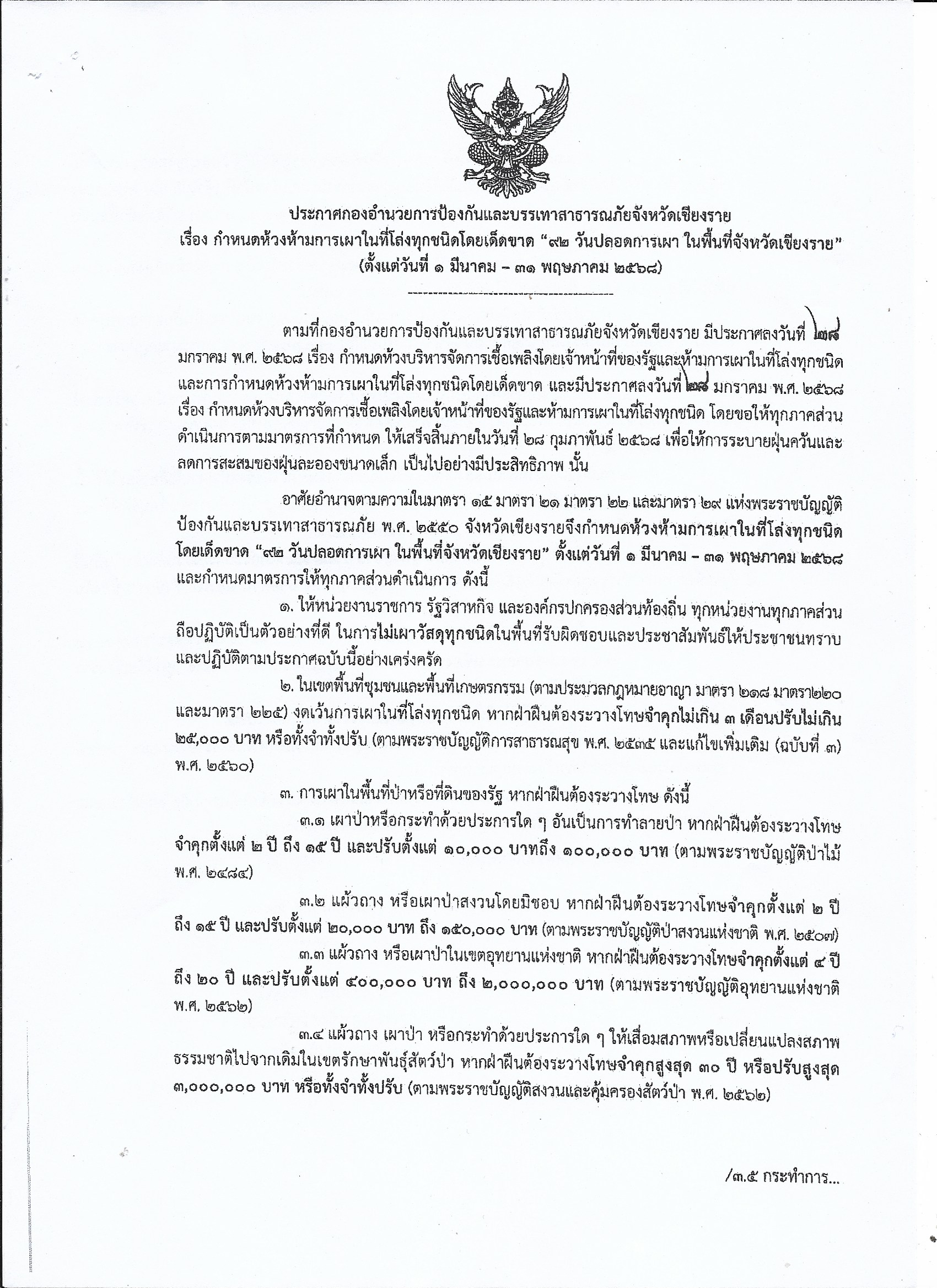 ประกาศกองอำนวยการป้องกันและบรรเทาสาธารณภัยจังหวัดเชียงรายเรื่อง กำหนดห้วงบริหารจัดการเชื้อเพลิงโดยเจ้าหน้าที่ของรัฐและห้ามการเผาในที่โล่งและการกำหนดห้วงห้ามการเผาในที่โล่งทุกชนิดโดยเด็ดขาด