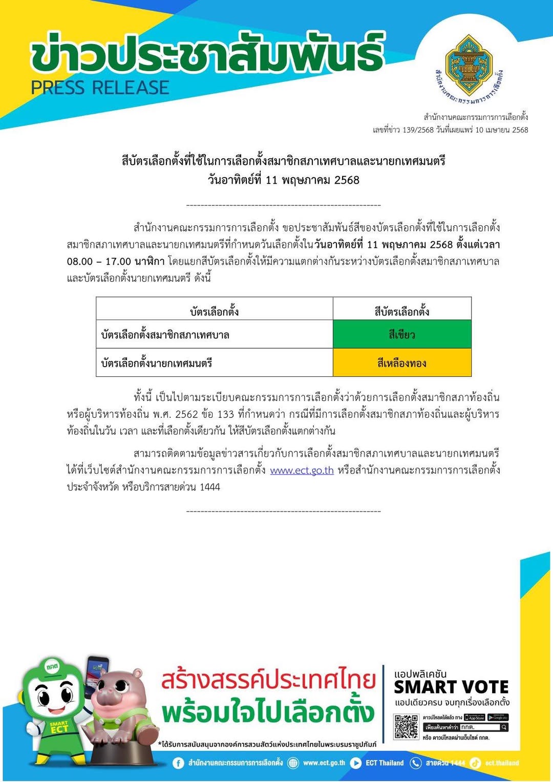 สีบัตรเลือกตั้งที่ใช้ในการเลือกตั้งสมาชิกสภาเทศบาลและนายกเทศมนตรี วันอาทิตย์ที่ 11 พฤษภาคม 2568