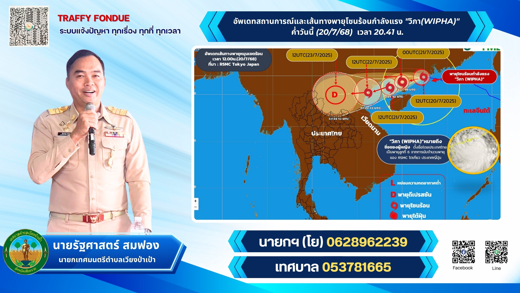 ชื่อเรื่อง : อัพเดทสถานการณ์และเส้นทางพายุโซนร้อนกำลังแรง "วิภา(WIPHA)" ค่ำวันนี้(20/7/68) เวลา 20.41 น. จากเพจ กรมอุตุนิยมวิทยา